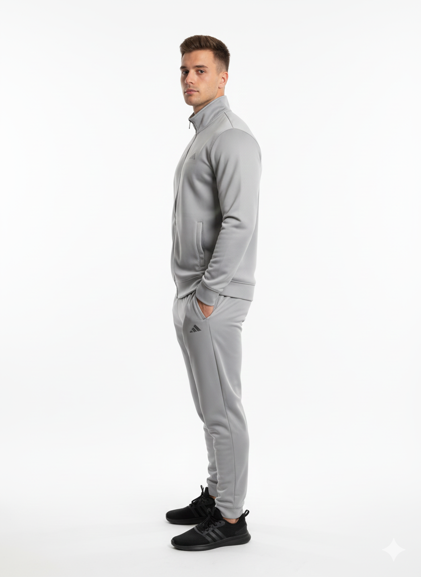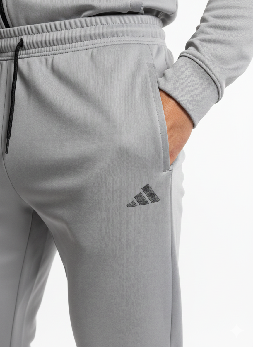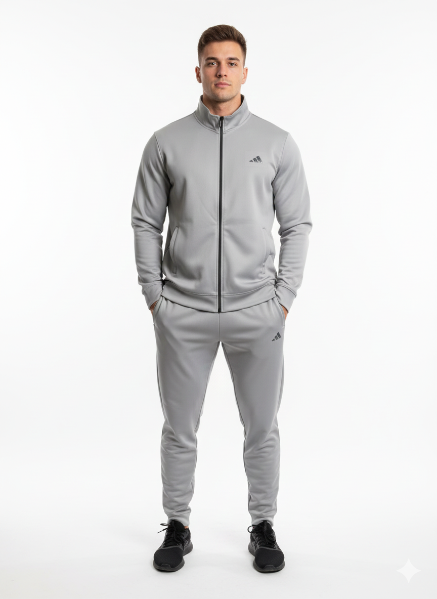 This is a classic, full-zip tracksuit set from Adidas in a light grey color, focusing on a sporty, functional look.
