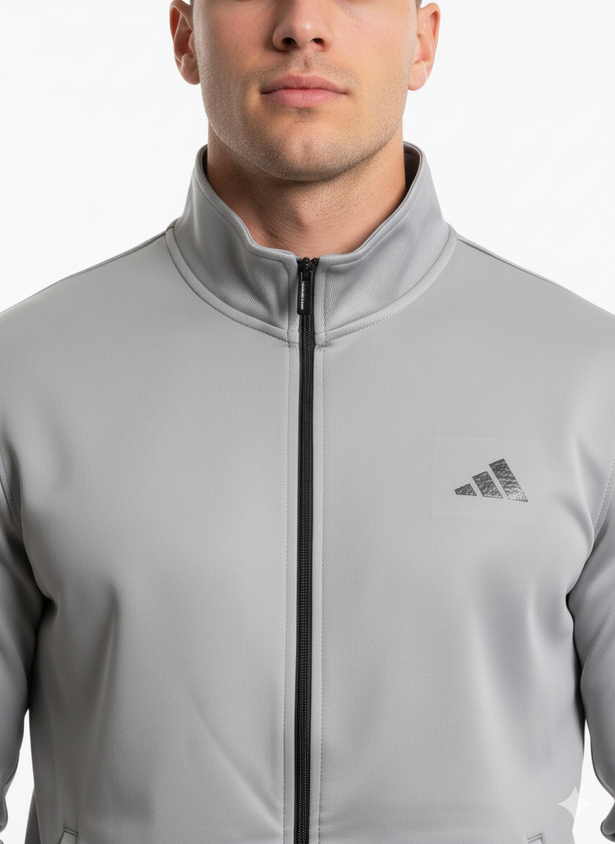 Details: Both the jacket zipper and the seams/trim appear to be in a contrasting dark color (black or dark grey), which adds subtle definition. The fit is athletic and tailored.