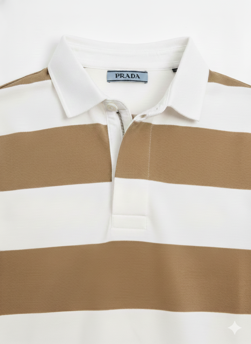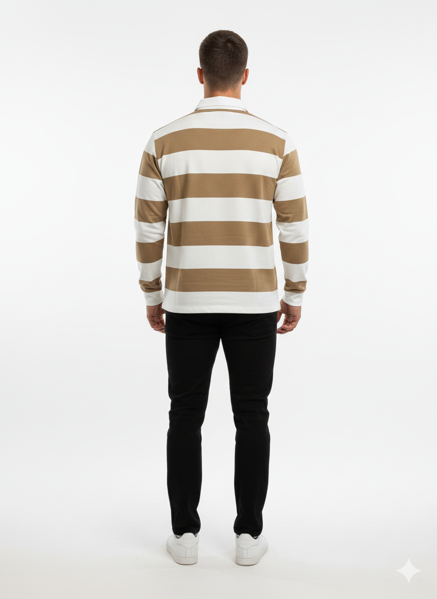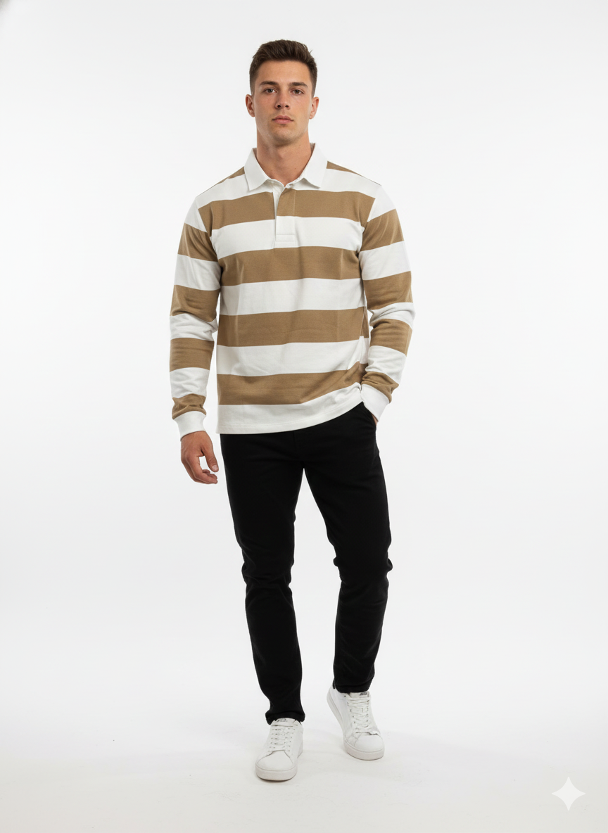 Upgrade your everyday look with our Heritage Stripe Rugby Polo, designed for those who appreciate classic style with modern comfort. Featuring bold horizontal stripes in warm beige and crisp white, this long-sleeve polo brings a fresh yet timeless aesthetic to your wardrobe.