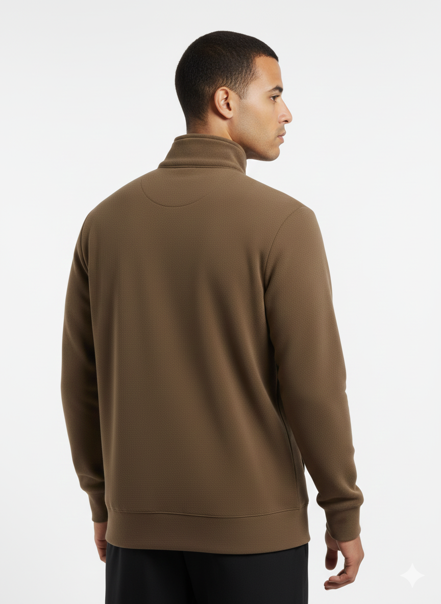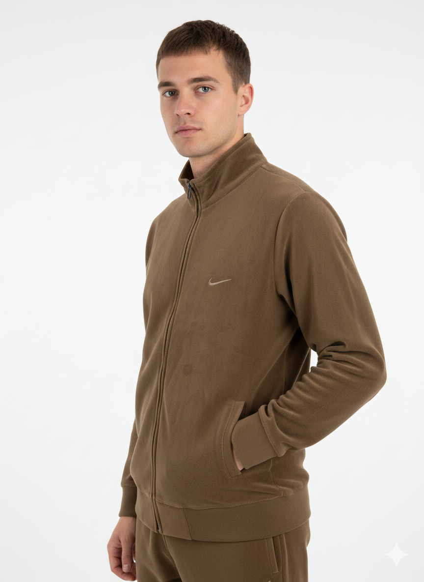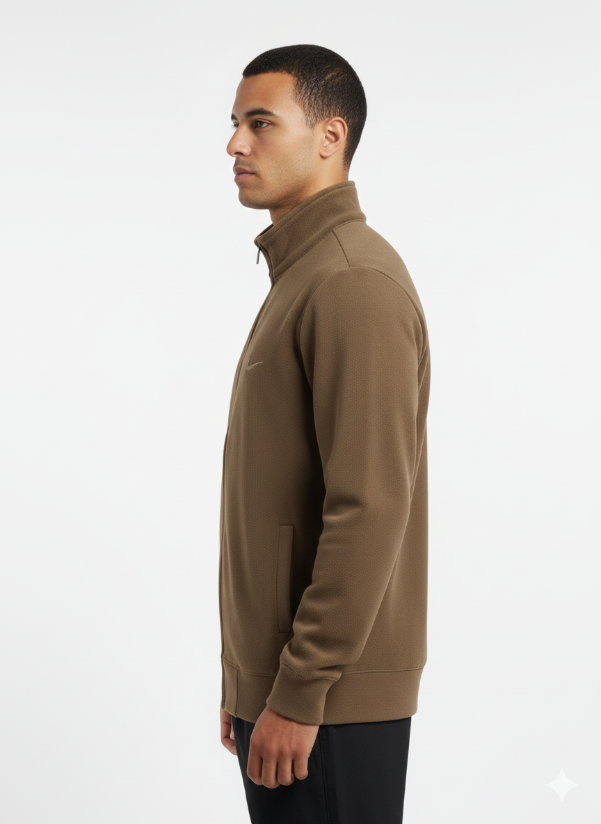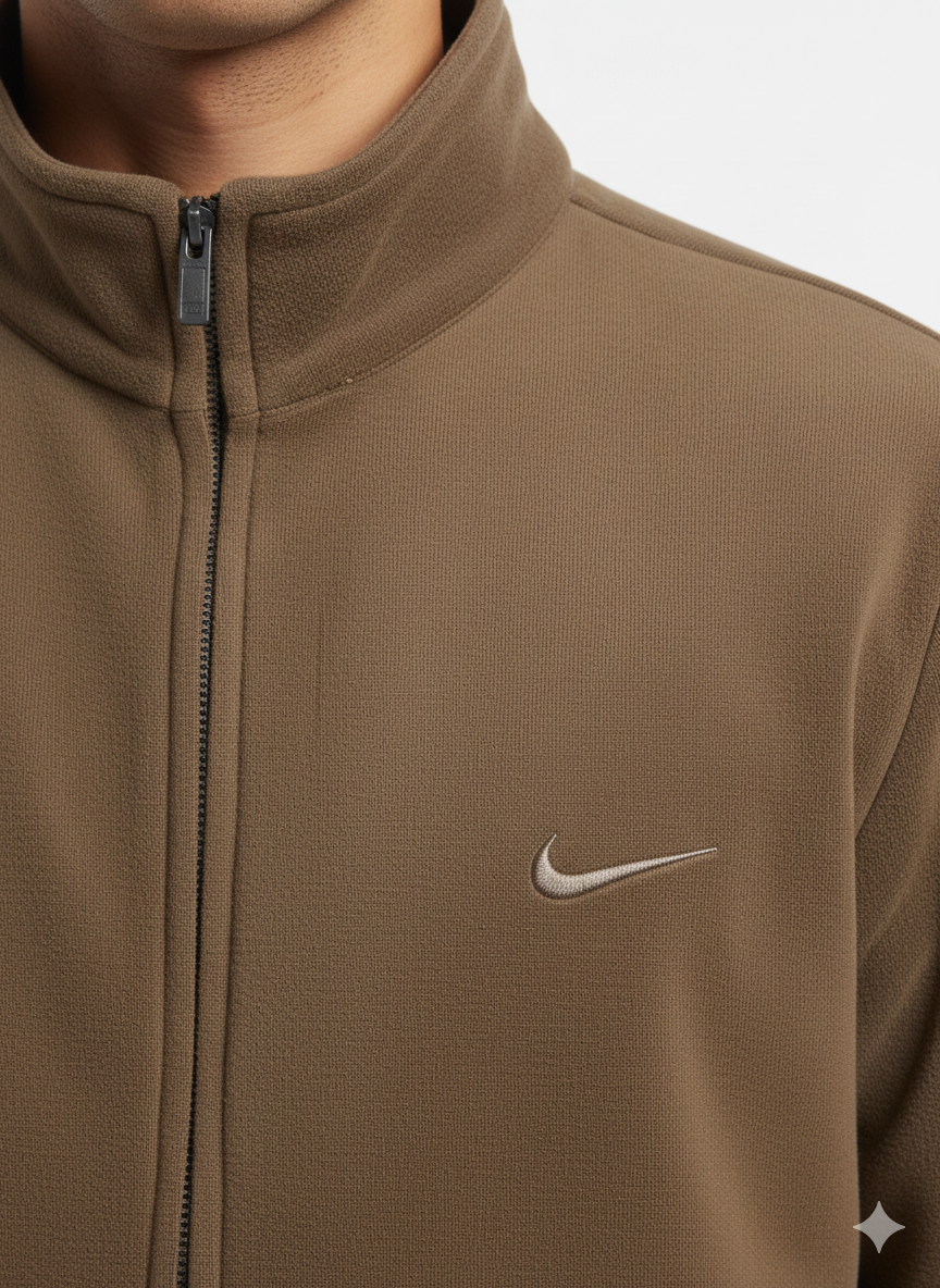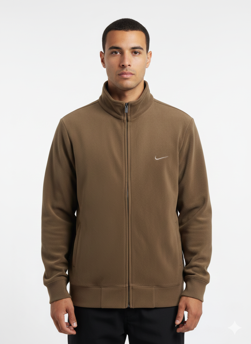 The rich, Earthy Brown/Taupe color is a versatile neutral, easy to pair with denim, black, or athletic gear. It features a classic mock neck for warmth and a full-length black zipper for adjustable ventilation. The timeless silhouette, defined by the clean ribbed cuffs and hem, provides a comfortable, standard fit that looks sharp on any body type. Finished with the iconic, subtle embroidered Nike Swoosh on the chest, this piece merges archived style with modern comfort.
