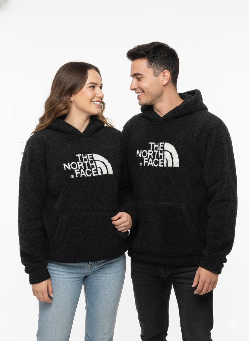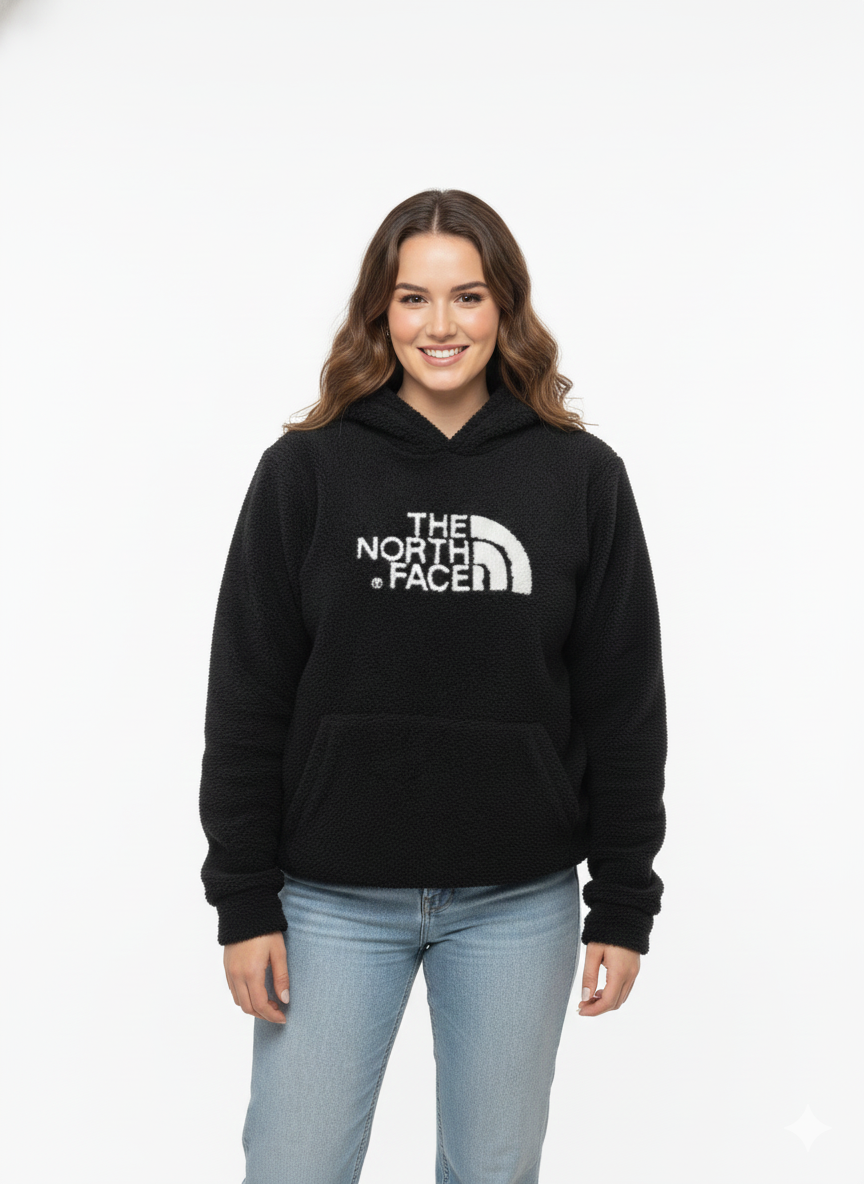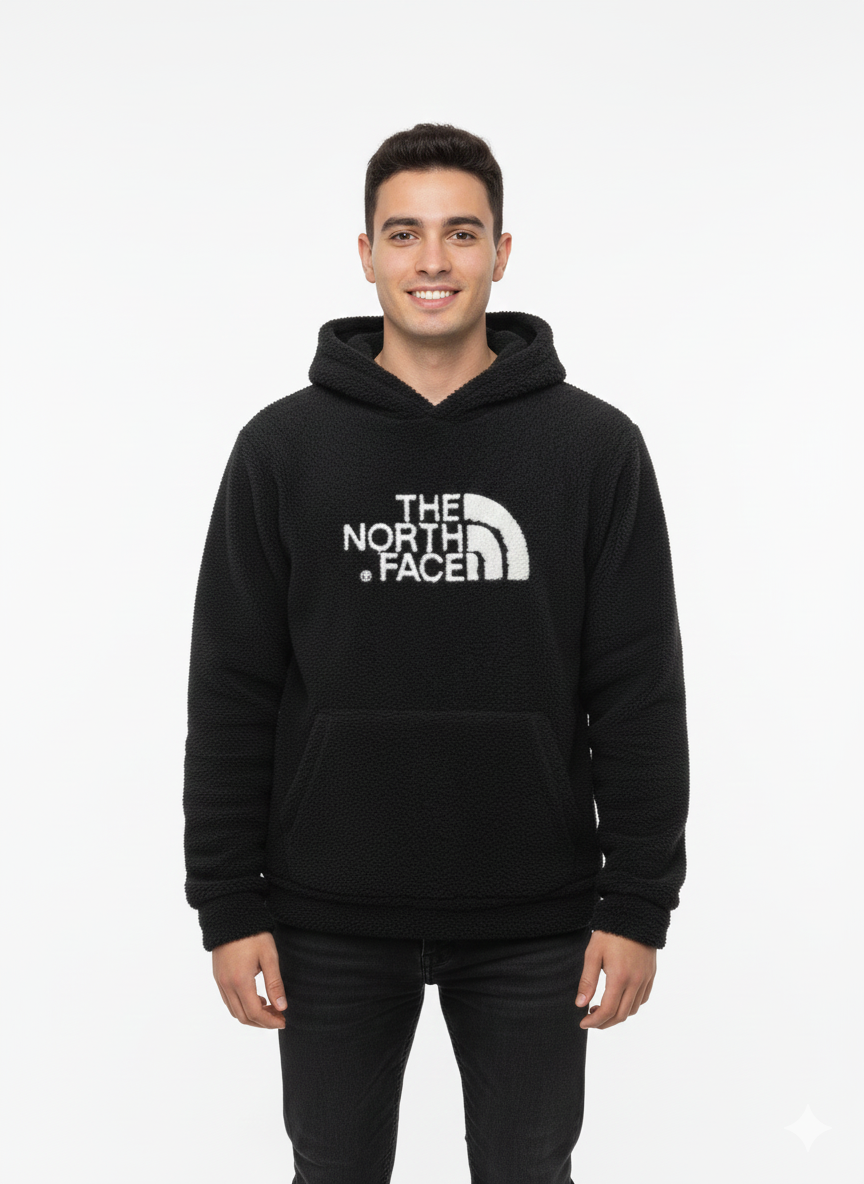 Embrace warmth and iconic style with The North Face Logo Woolen Pullover Hoodie. Designed to be a versatile staple for anyone, this cozy unisex hoodie features a striking deep black color and a unique, plush, textured fleece construction, offering superior comfort and heat retention on the coldest days.