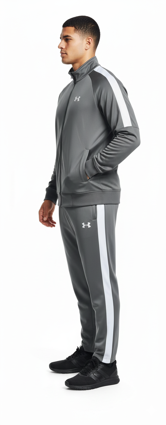 Under Armour Branding: The iconic UA logo is displayed prominently on the left chest of the jacket and the left thigh of the pants.