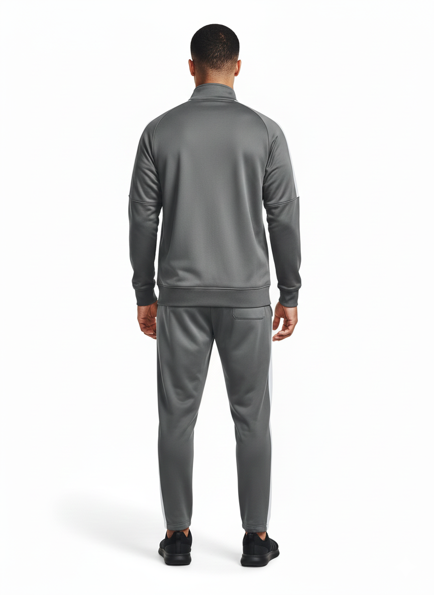 Signature Styling: Features a modern Grey/Charcoal base color with contrasting White piping/panels that run down the sleeves and sides of the legs, giving it a dynamic, athletic look.